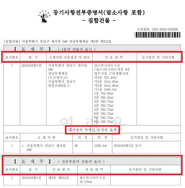 표제부(건물정보), 갑구(주인정보), 을구(빚정보)
